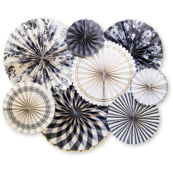 Conjunto de abanicos de varios tamaños, en colores gris, negro y crema con ribetes dorados.