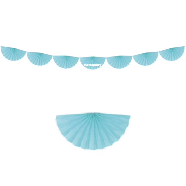Guirnalda de 8 abanicos de papel color azul de 4 metros de longitud. Disponible en más colores dentro de nuestro catálogo.