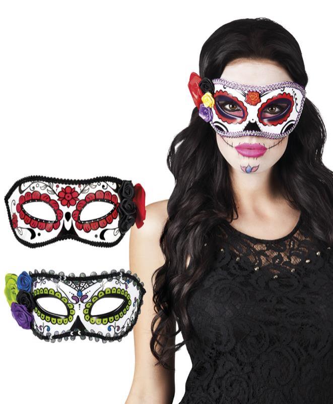 Máscara de plástico resistente decorada con tejido. Flores de tela.