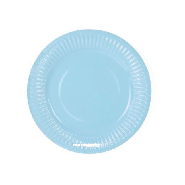 Set de 8 platos de cartón color azul pastel. La compra mínima de este producto es de 2 sets (16 platos en total).
