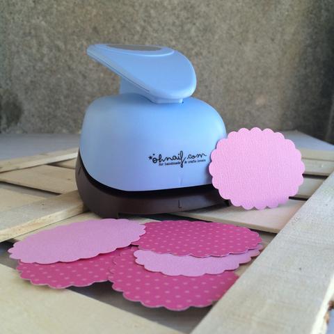 Troqueladora en forma de elipse con borde de blondas de 2,5″, medidas aprox. de la pieza troquelada 6,3 x 4,7 cm., siendo el LARGO la mayor medida del troquelado y el  ANCHO la menor.